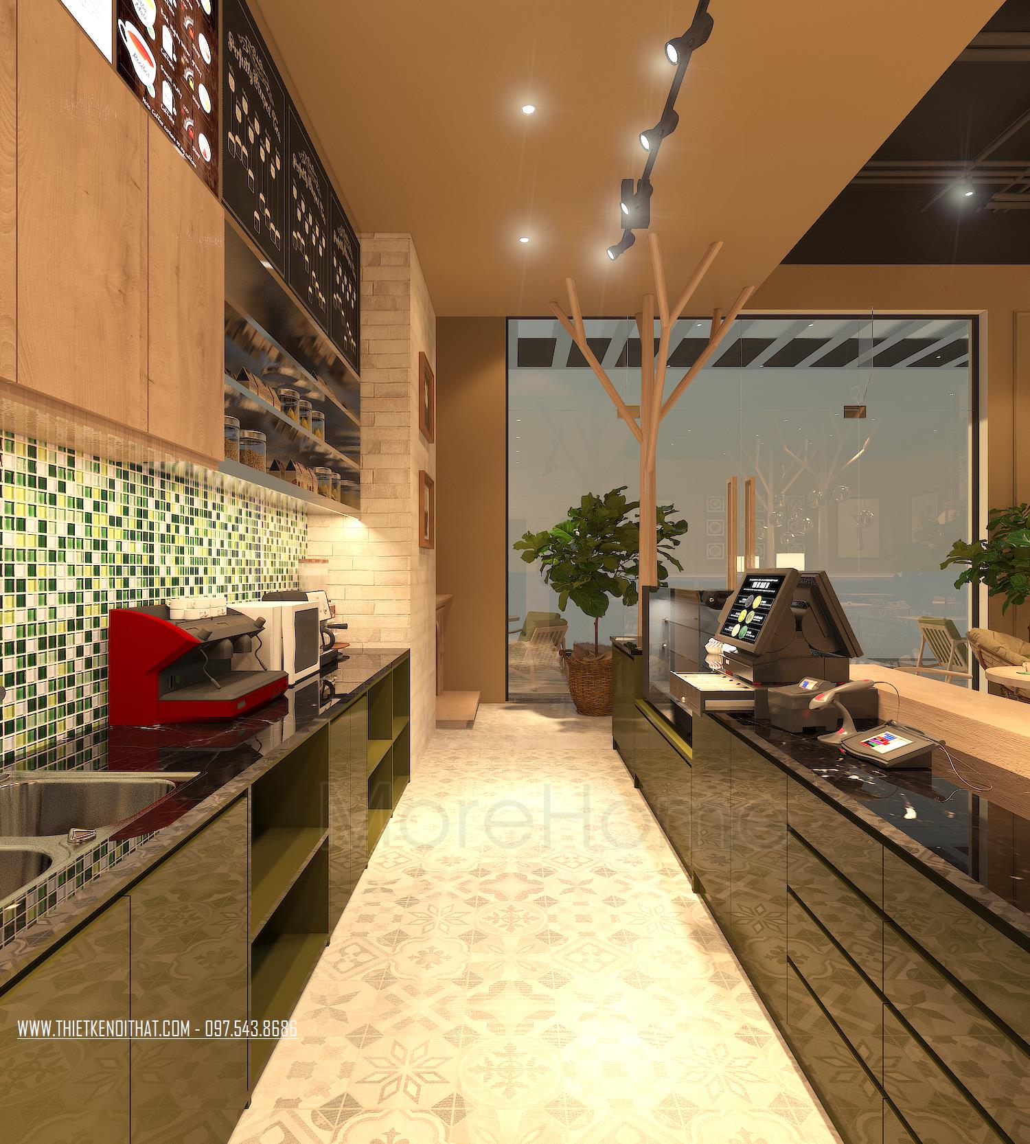 Quầy gọi món thiết kế mở, không tạo vách ngăn giúp mở rộng khả năng quan sát cho nhân viên. Bên cạnh đó, thiết kế tủ gỗ kệ cao ráo, sạch sẽ với menu in nổi, sáng, dễ theo dõi và tiết kiêm thời gian cho cả thực khách và nhân viên. Các loại đá lát ở kệ bếp cũng được kiến trúc sư hết sức để tâm khi sử dụng các tone màu xanh đa dạng sắc độ, tạo sự thống nhất trong thiết kế. Ánh sáng nhân tạo cung cấp đầy đủ, giúp không gian bừng sáng và nổi bật trong nhất trong thiết kế này.