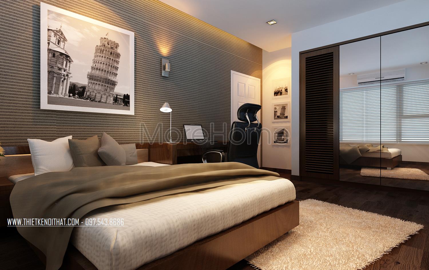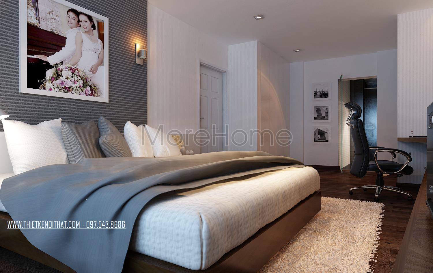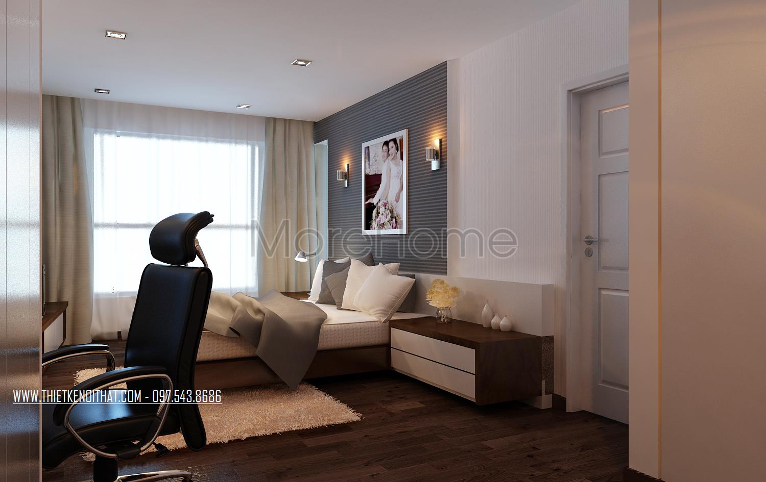 Thiết kế nội thất phòng ngủ hiện đại khá đơn giản. Điểm nhấn của không gian này chính là thiết kế hai cửa sổ mở rộng giúp đem đến sự cân bằng trong không gian sống nội và ngoại thất. Chính vì thiết kế này mà ánh sáng tự nhiên được tận dụng một cách triệt để mang đến cho gia chủ sự hứng khởi, tránh cái bí bách và gò bó của thiết kế bốn bức tường đơn điệu.