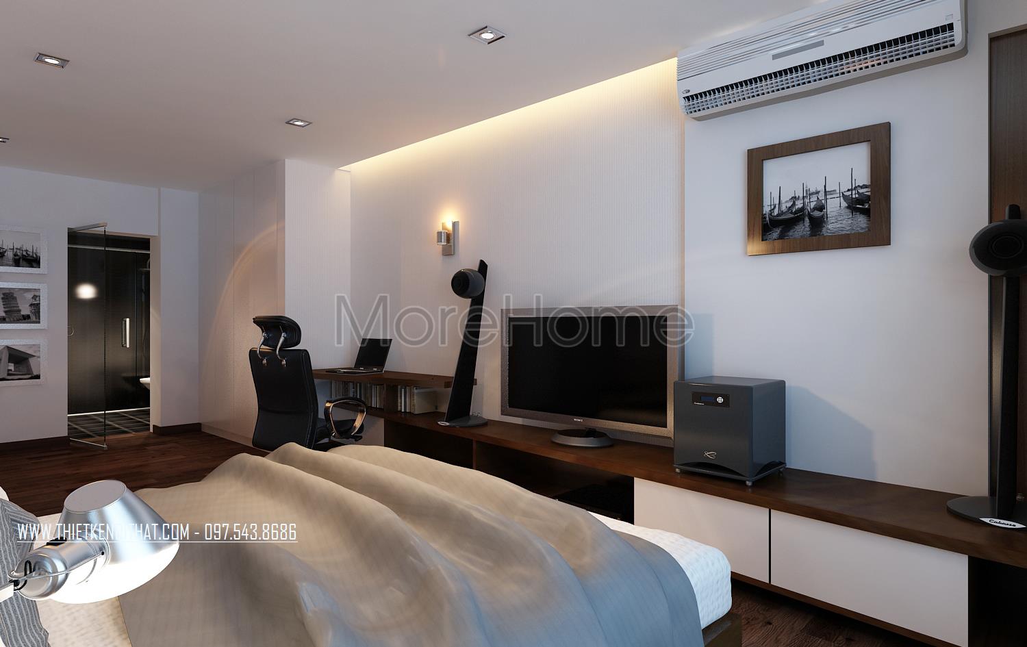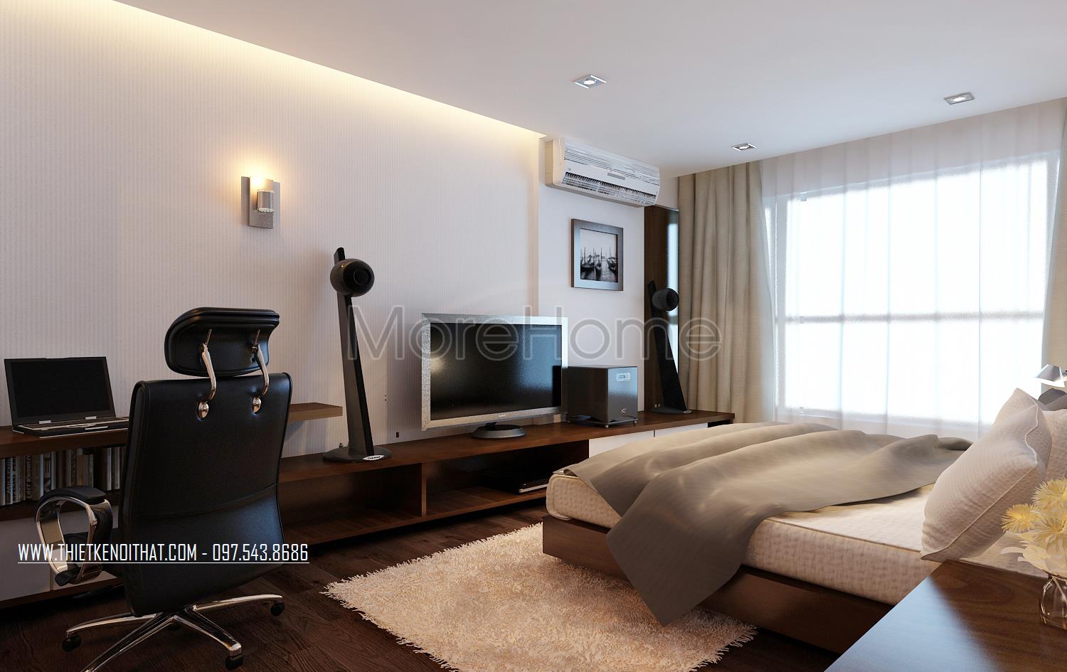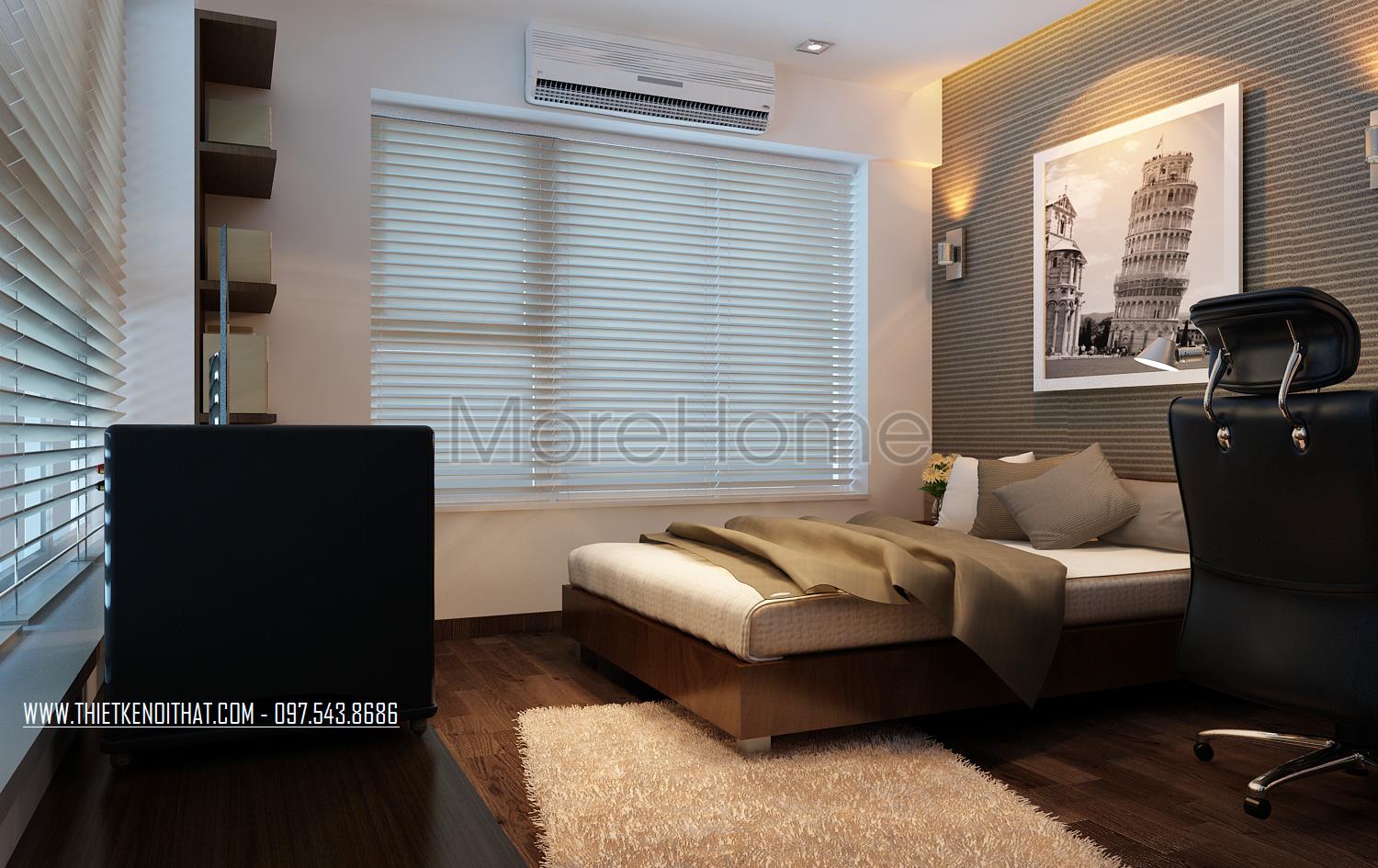 Thiết kế nội thất phòng ngủ hiện đại khá đơn giản. Điểm nhấn của không gian này chính là thiết kế hai cửa sổ mở rộng giúp đem đến sự cân bằng trong không gian sống nội và ngoại thất. Chính vì thiết kế này mà ánh sáng tự nhiên được tận dụng một cách triệt để mang đến cho gia chủ sự hứng khởi, tránh cái bí bách và gò bó của thiết kế bốn bức tường đơn điệu.
