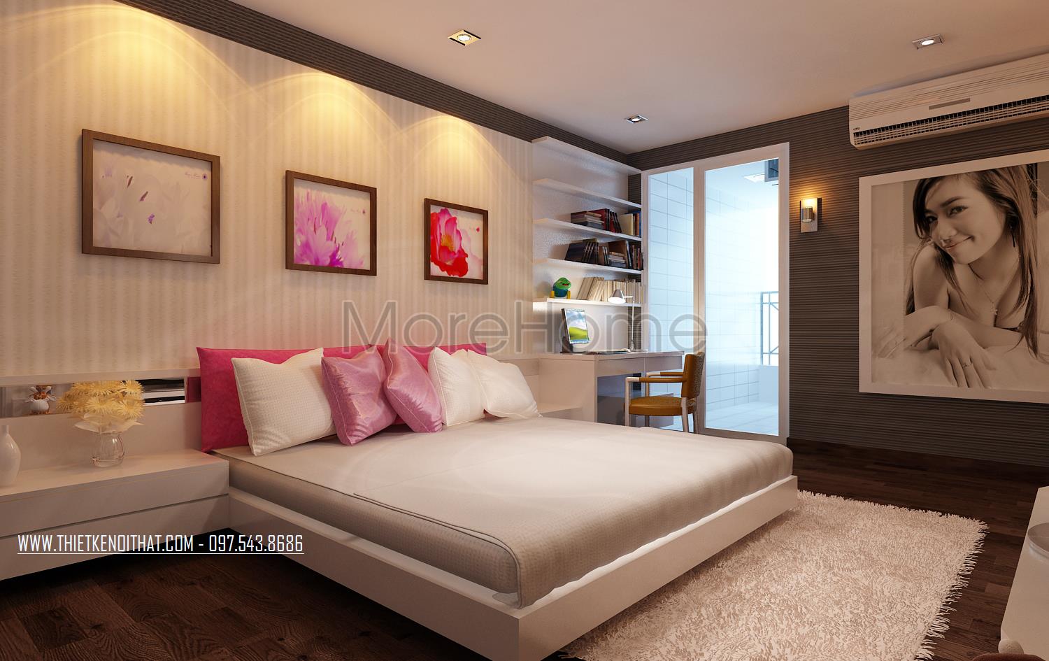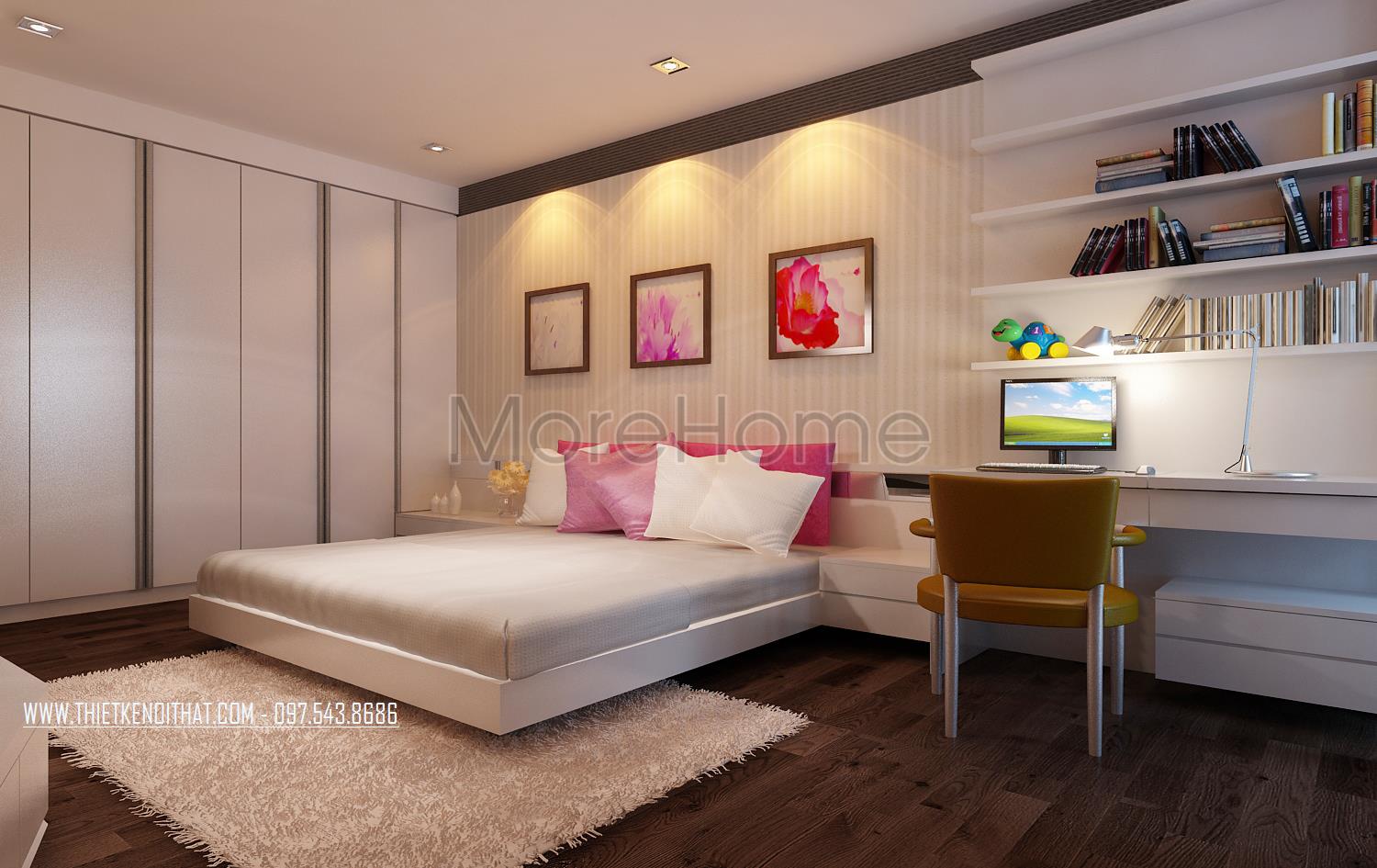 Thiết kế nội thất phòng ngủ tiếp theo sử dụng tone màu hồng phấn nhẹ mang đến sự nhẹ nhàng và nữ tính hơn hẳn. Các thiết kế tủ kệ thanh ngang vẫn được kiến trúc sư lựa chọn giúp tạo điểm nhấn công năng, linh hoạt khi thu dọn, và hơn cả đó là tạo độ thoáng cho không gian.