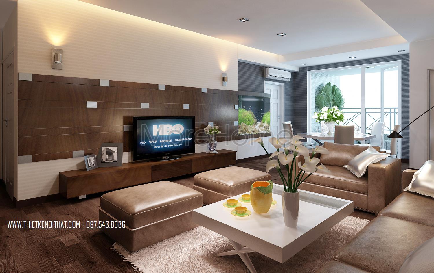 Thiết kế nội thất phòng khách hiện đại sử dụng tone màu nâu sáng mang đến cảm giác gần gũi và ấm áp cho không gian sống. Khung cửa sổ rộng với tầm nhìn mở mang ánh sáng tự nhiên vào căn phòng giúp tạo hứng khởi và sự tươi trẻ cho căn phòng. Bên cạnh đó, với thiết kế không gian mở căn phòng nhỏ trở nên thoáng hơn rất nhiều đồng thời tạo cảm giác cơi nới cho không gian hẹp.
