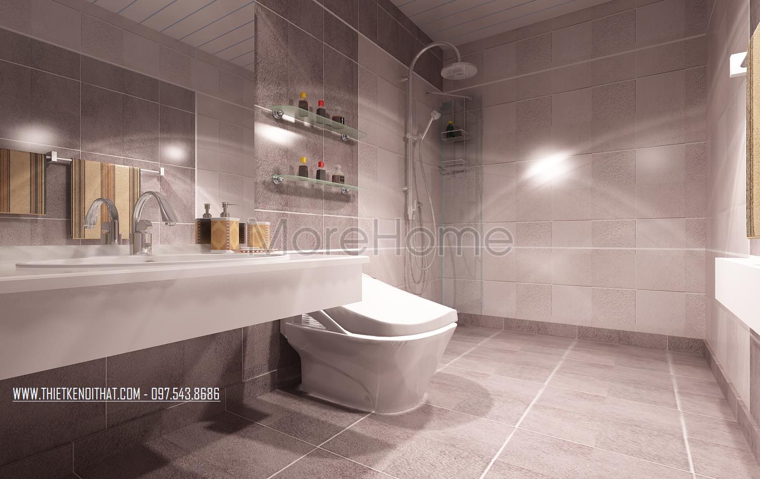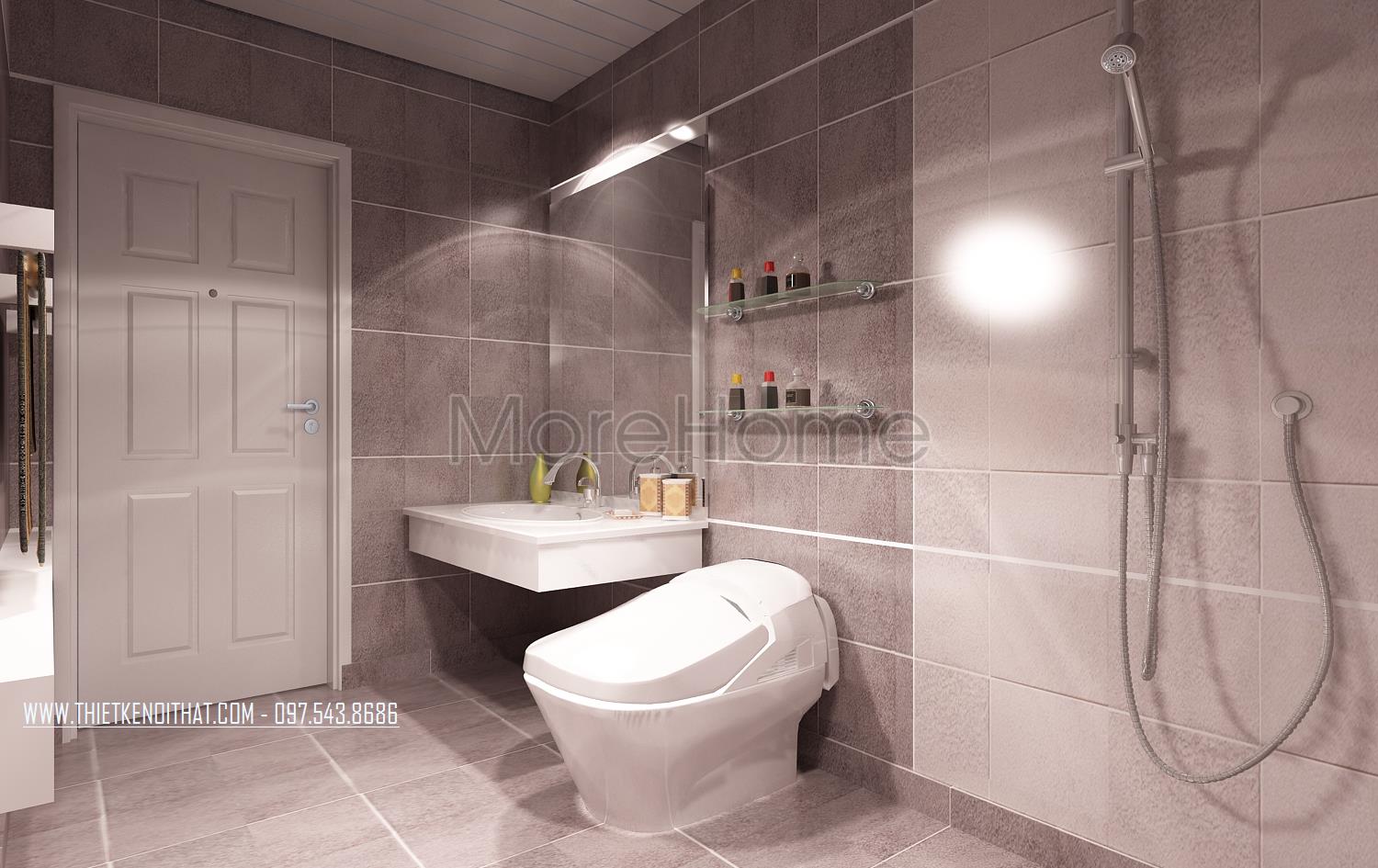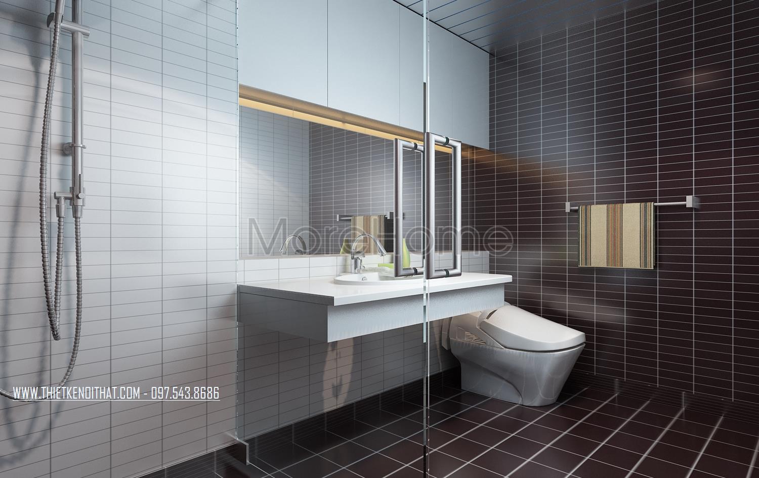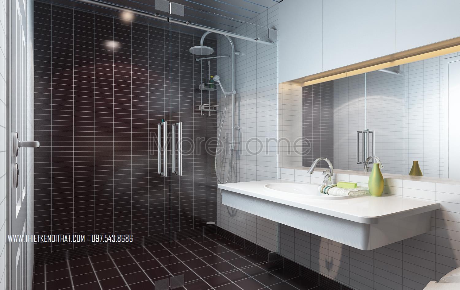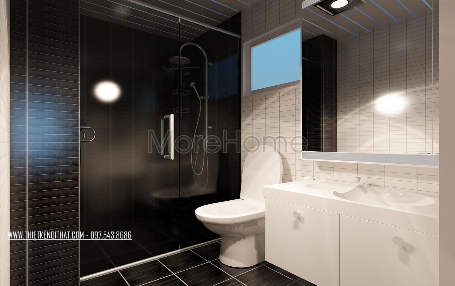 Cuối cùng là thiết kế nội thất nhà vệ sinh hiện đại. Các vật liệu nhẹ như kính cường lực và gương được kiến trúc sư lựa chọn và sử dụng khá nhiều. Đặc điểm phản chiếu và trong suốt của hai vật liệu này cũng chính là yếu tố căn bản tạo độ thoáng và giúp không gian nhà vệ sinh trở nên mở hơn rất nhiều. Các thiết kế khác được sử dụng hai tone màu căn bản là trắng và đen mang đến sự hiện đại thống nhất xuyên suốt cả căn hộ.