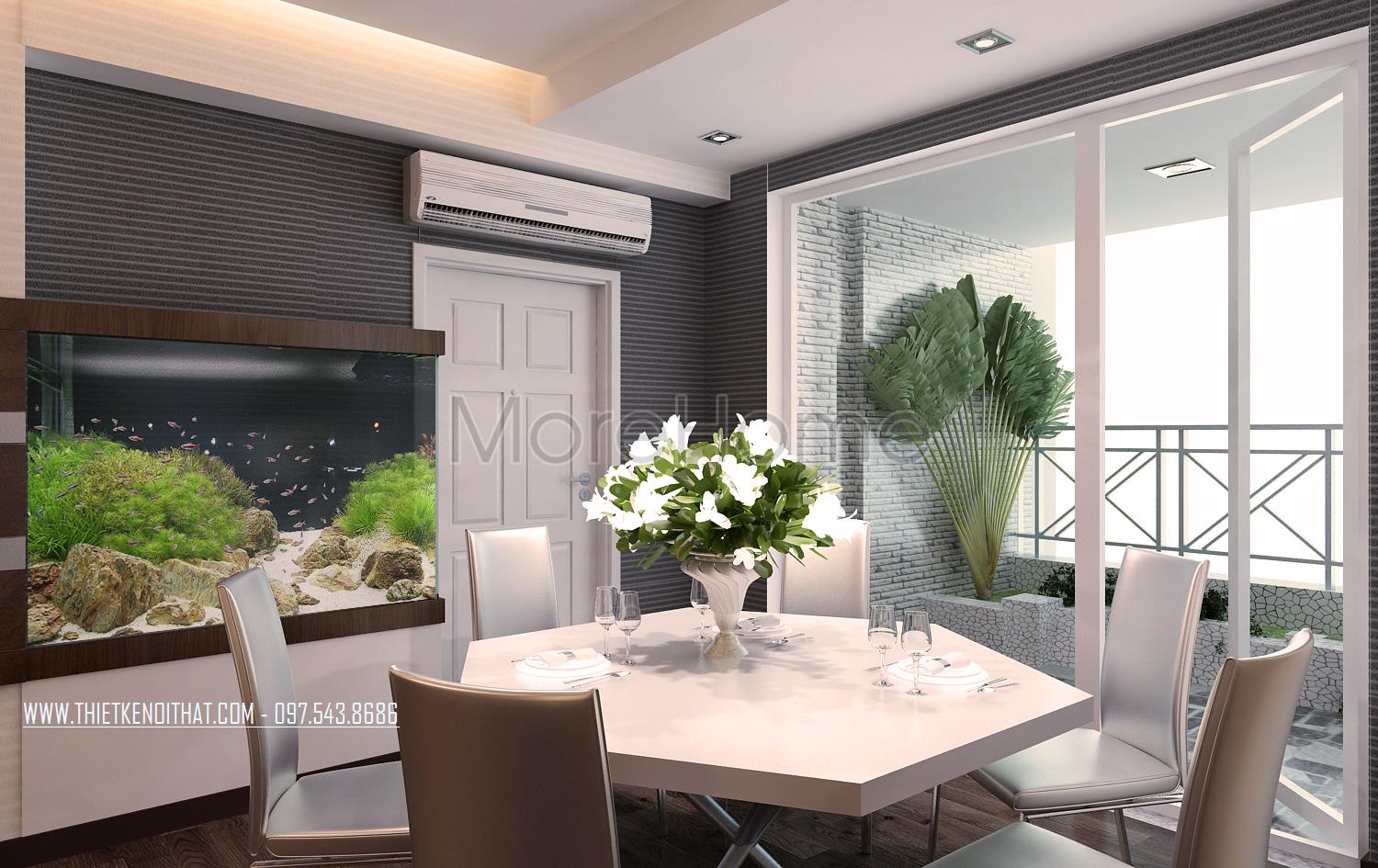 Thiết kế nội thất không gian phòng ăn được sắp xếp liền kề với phòng khách và hướng ra ban công mở. Với thiết kế bàn ăn dạng lục lăng khá ấn tượng, kiến trúc sư đã tạo một điểm nhấn thẩm mỹ sáng tạo cho căn phòng. Thiết kế dạng quây gọn gàng cũng là một cách tiết kiệm diện tích là linh hoạt trong sắp đặt và bố trí nội thất.