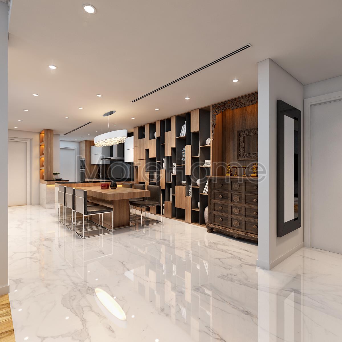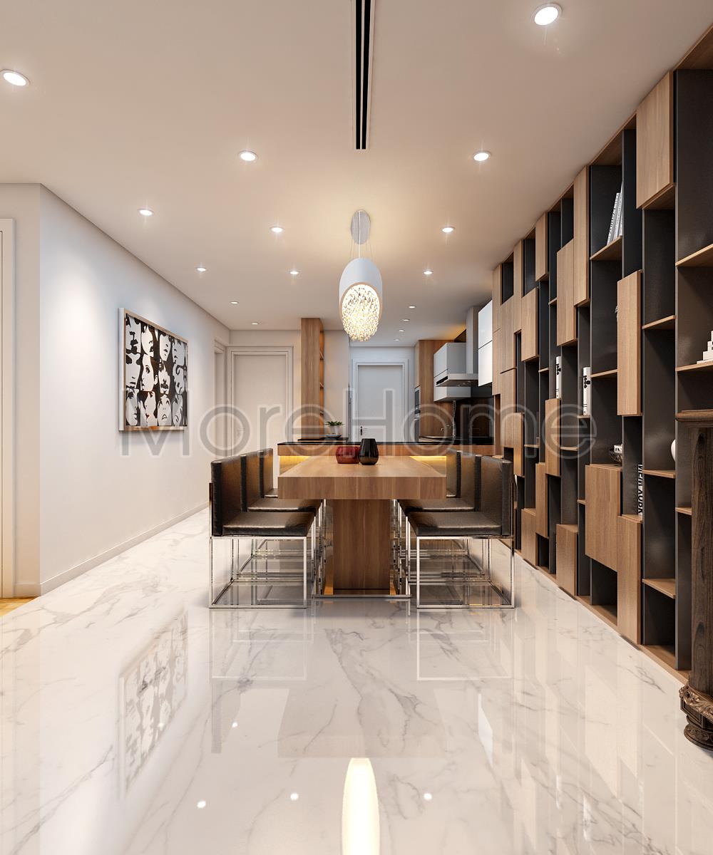 Thiết kế nội thất phòng ăn hiện đại gây ấn tượng bởi vẻ đẹp hiện đại và sự ngăn nắp, gọn gàng. Bàn ăn được thiết kế đơn giản, không quá trọng các chi tiết trang trí cầu kỳ hay các màu sắc nổi trội mà thay vào đó là thiết kế đường nét rõ ràng với tone màu nâu sáng, tạo sự đồng nhất và liền mạch trong thiết kế. Điểm nhấn đáng chú ý nhất của không gian bàn ăn chính là thiết kế tủ gỗ ấm tường kết hợp kệ trang trí. Với thiết kế trẻ trung phá cách, kiến trúc sư đã khéo léo giữ được nét hiện đại trong thiết kế mà vẫn đảm bảo tính tiện nghi và linh hoạt cho không gian.