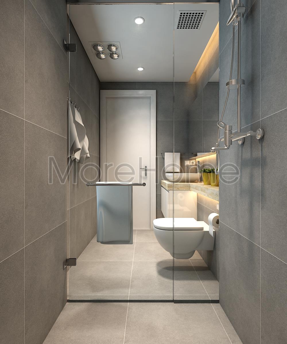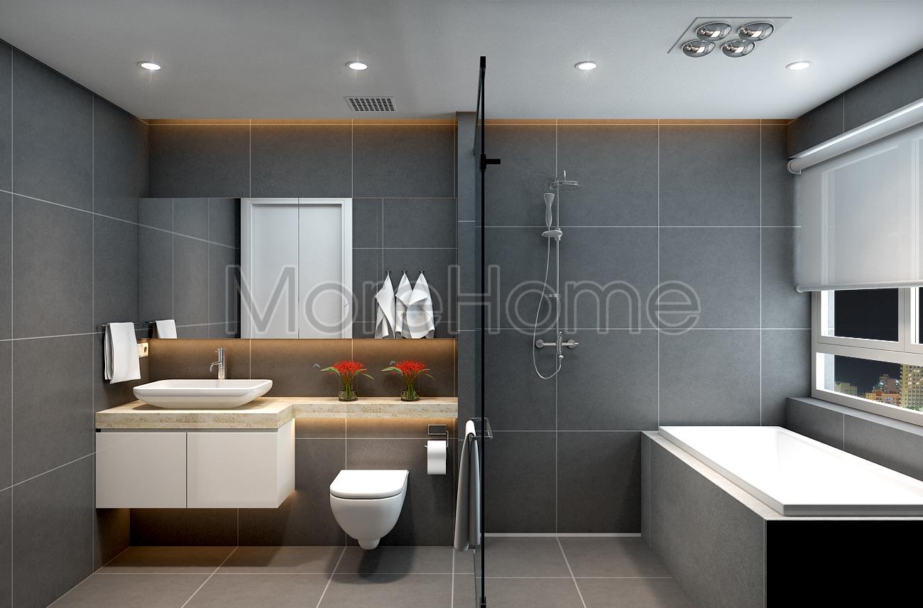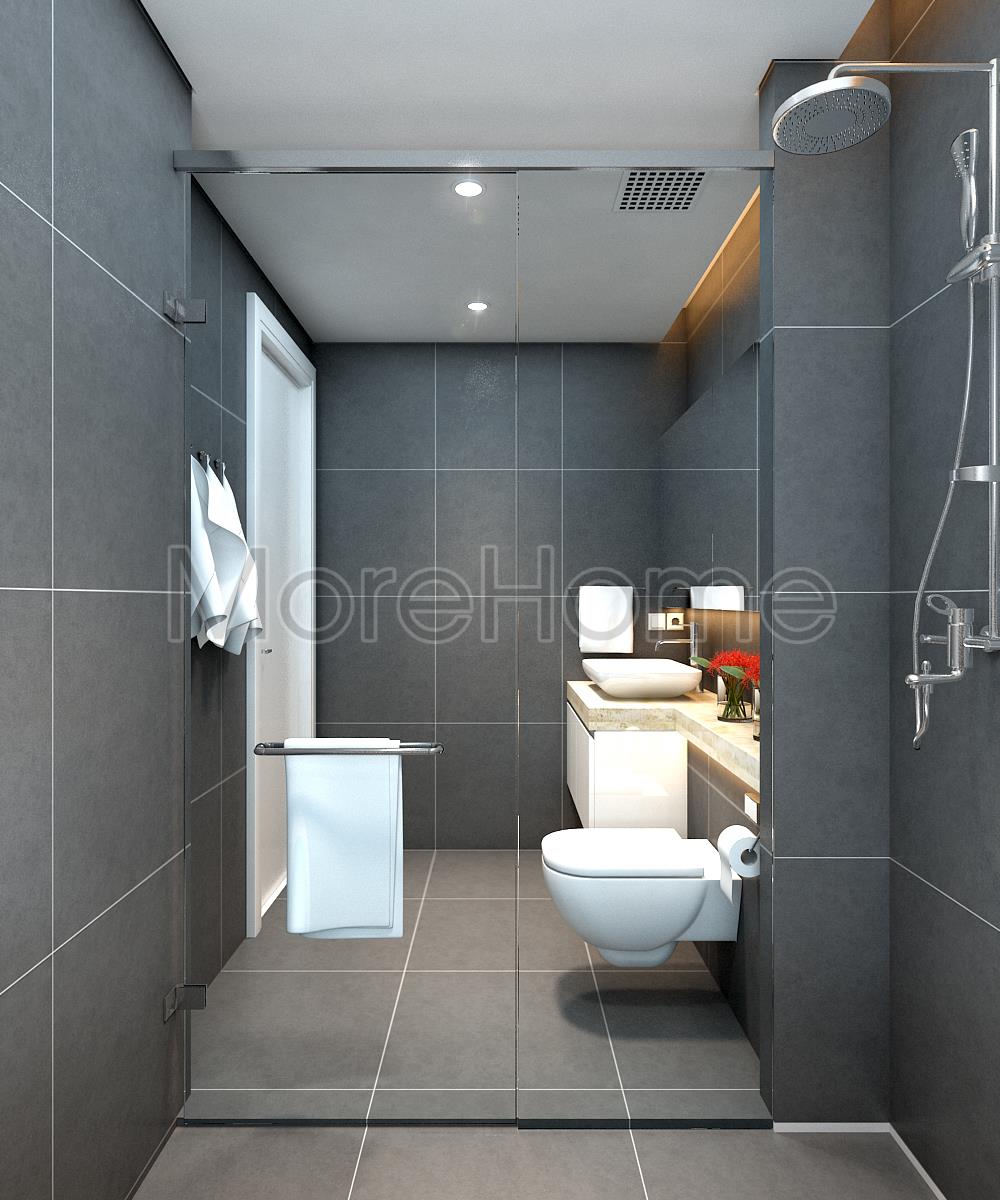 Thiết kế nội thất phòng tắm đơn giản với hai tone màu đối lập từ sắc ghi tối của đá ốp tường với sắc trắng từ các thiết bị vệ sinh hiện đại mang đến cảm giác cân bằng về màu sắc cho không gian WC. Điểm hạn chế về mặt diện tích được khắc phục bằng cách sử dụng các vật liệu tạo độ phản chiếu nhẹ như gương và kính giúp tăng độ thoáng cho căn phòng.