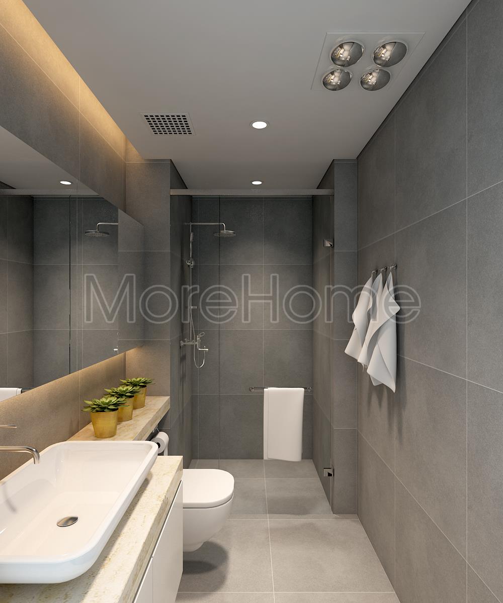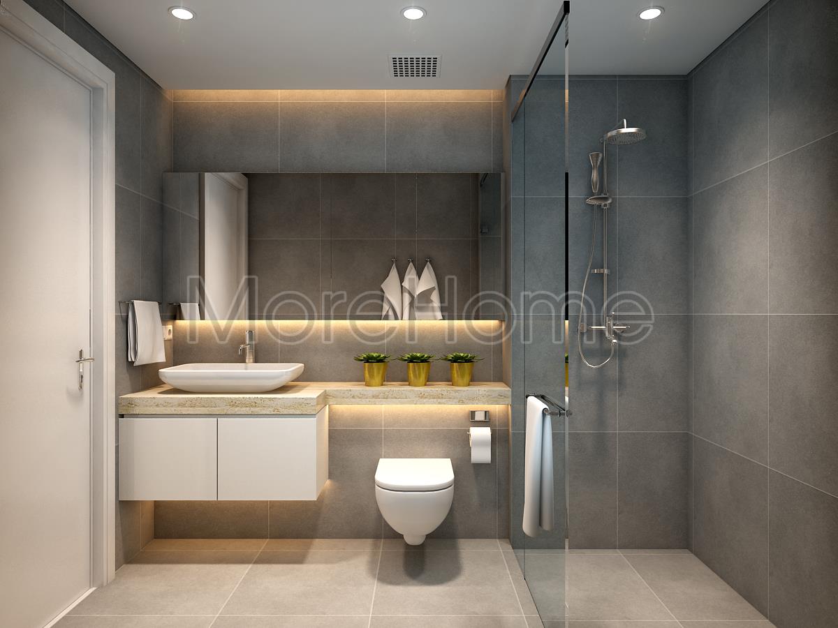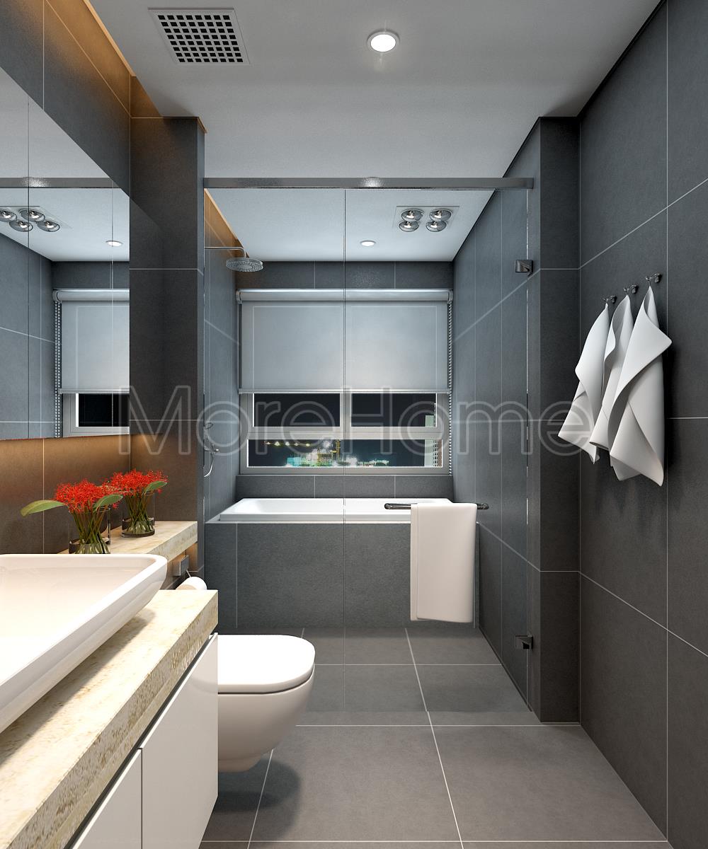 Thiết kế nội thất phòng tắm đơn giản với hai tone màu đối lập từ sắc ghi tối của đá ốp tường với sắc trắng từ các thiết bị vệ sinh hiện đại mang đến cảm giác cân bằng về màu sắc cho không gian WC. Điểm hạn chế về mặt diện tích được khắc phục bằng cách sử dụng các vật liệu tạo độ phản chiếu nhẹ như gương và kính giúp tăng độ thoáng cho căn phòng.