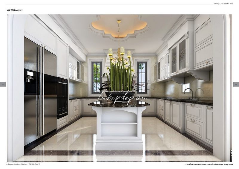 Gia đình mong muốn một không gian tinh tế và sang trọng để chuẩn bị bữa cơm. Vì vậy, họ đã chọn thiết kế phòng bếp màu trắng theo phong cách tân cổ điển, cùng với một số chi tiết màu đen đối lập như mặt bàn, viền đá lát sàn,.. để tạo nên một không gian ấm áp và đẹp mắt.