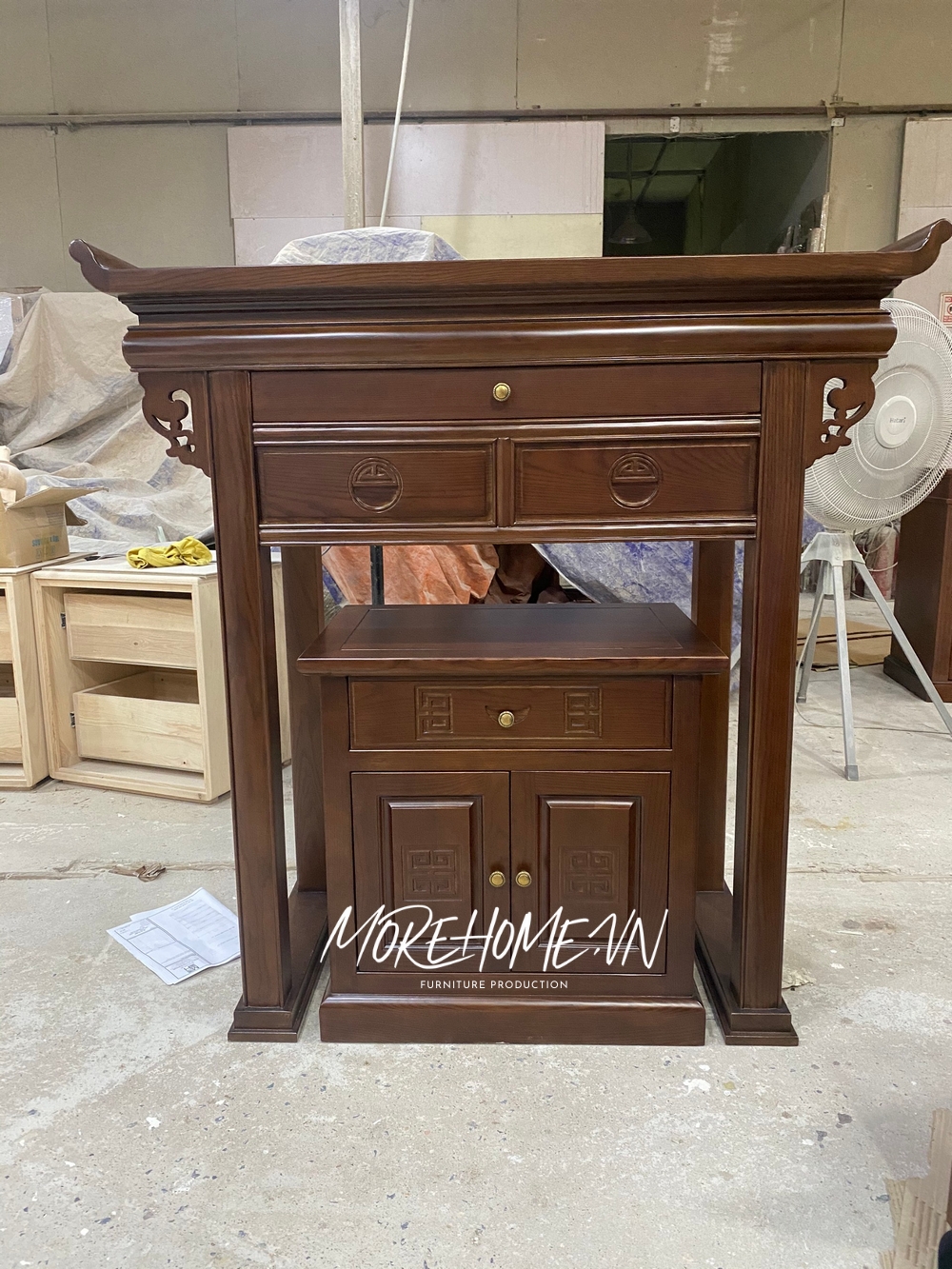 Mẫu bàn thờ gỗ tự nhiên được sản xuất tại Morehome các thợ lâu năm có kính nghiệm dựa vào 2 yếu tố truyền thống và phong thủy thể hiện sự biết ơn, thành kính sâu sắc tới thế hệ đi trước